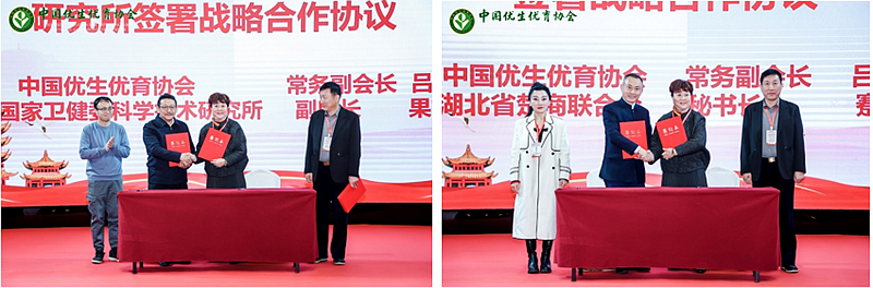 中国优生优育协会常务副会长吕贞臻、国家卫生健康委科学技术研究所副所长果吉尔锑、湖北省楚商联合会蹇宏秘书长分别代表本单位签署战略合作框架协议。